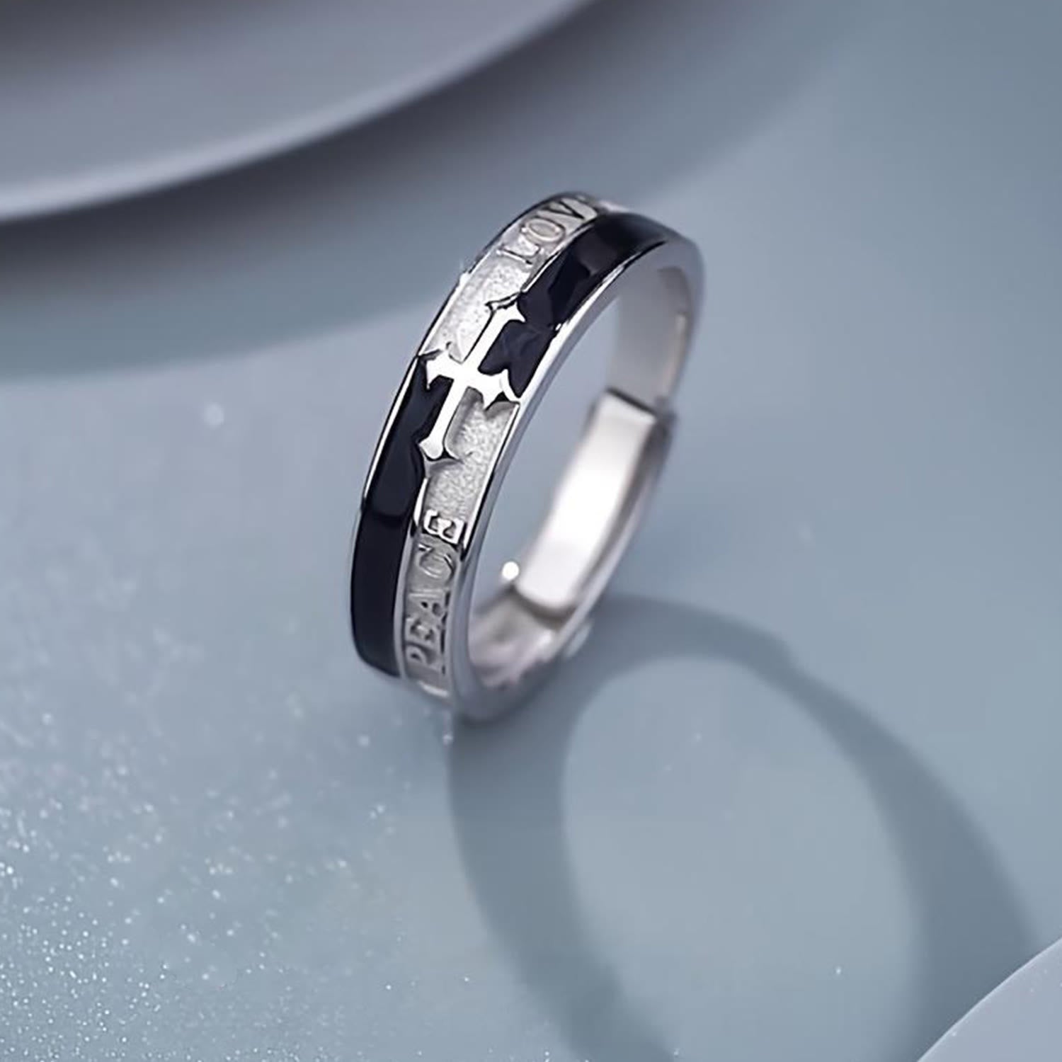 Featuring a sleek band with a cross emblem and the words “PEACE” and “LOVE”, this ring radiates spiritual reflection and understated style — inviting contemplation on faith-driven values in everyday moments.
