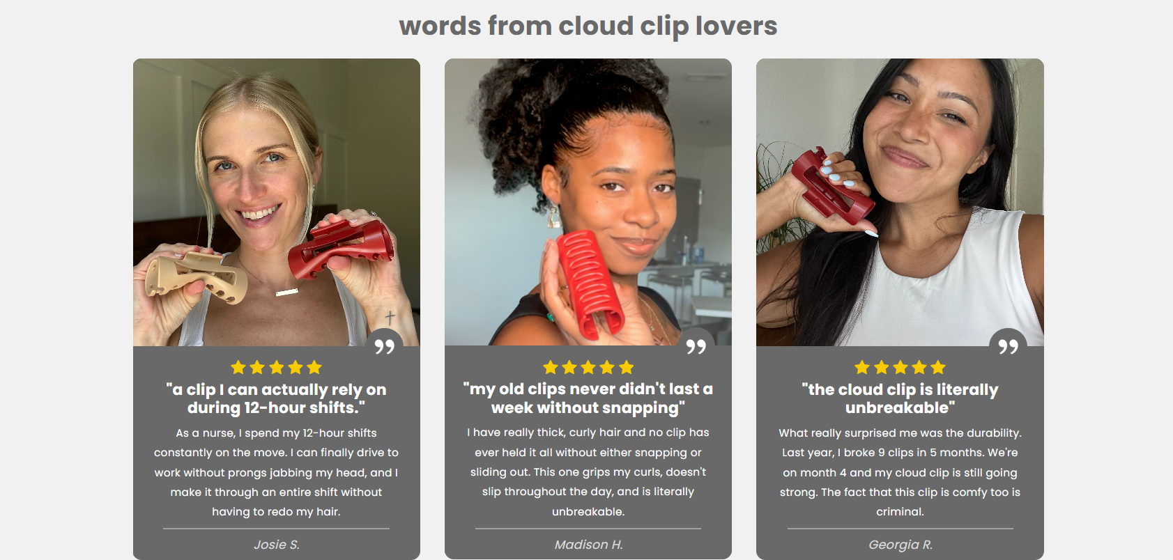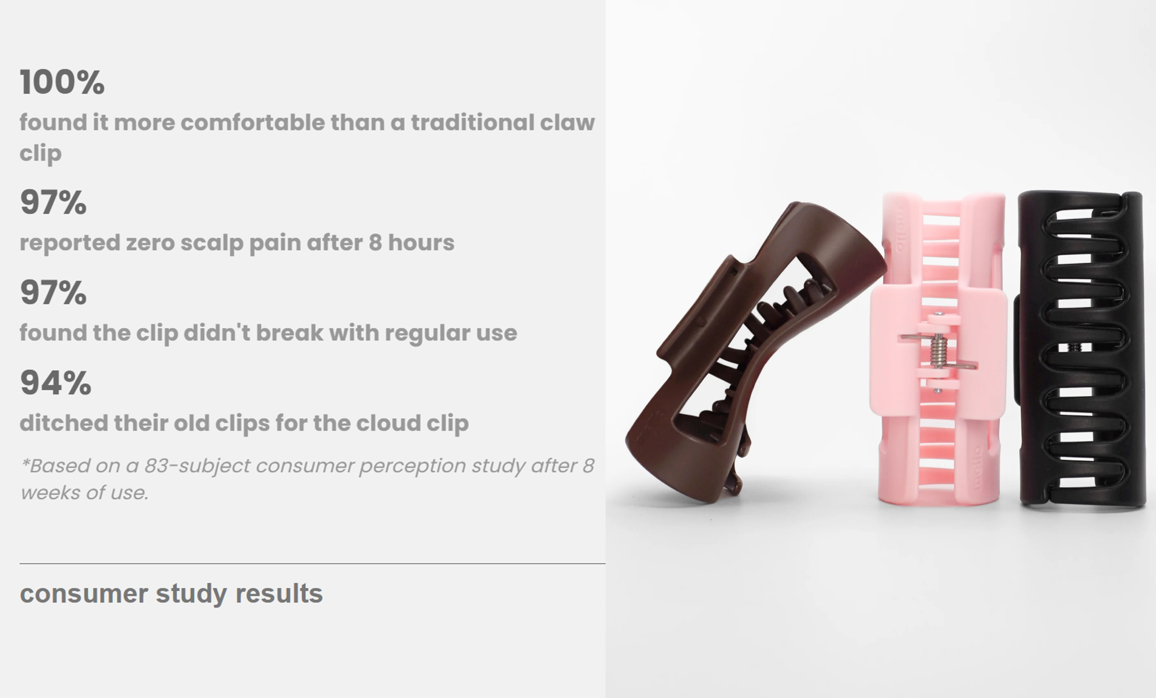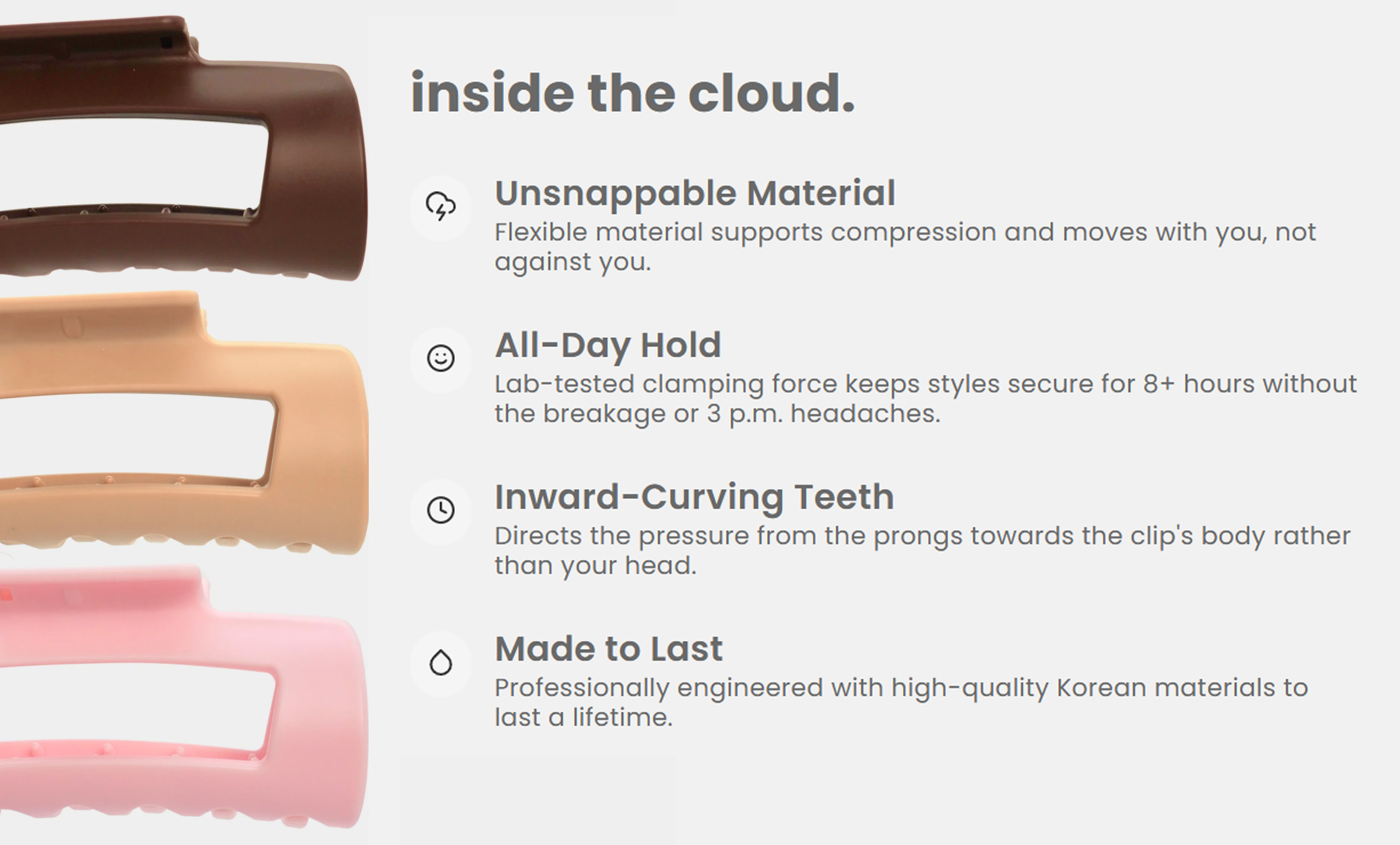"Beauty shouldn't be a safety hazard." A clip is a small thing, until it’s the reason for a head injury. Switch to the Cloud Clip. Protect your beauty, and more importantly, protect your head.
