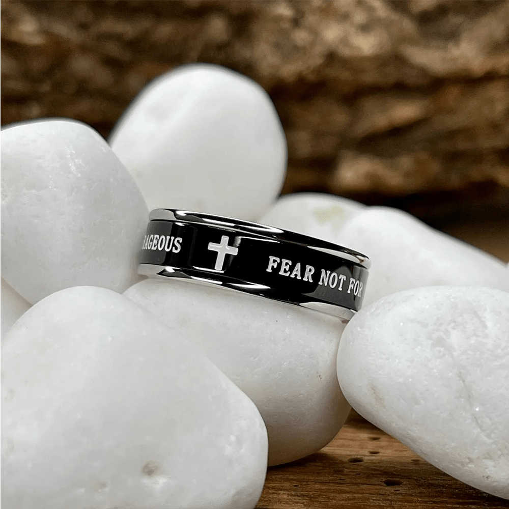 A sleek, two-tone rotating band engraved with the phrase “FEAR NOT” and “COURAGEOUS,” accented by a subtle cross. This polished, modern ring anchors faith in a daily reminder to walk in courage and trust in His promise.